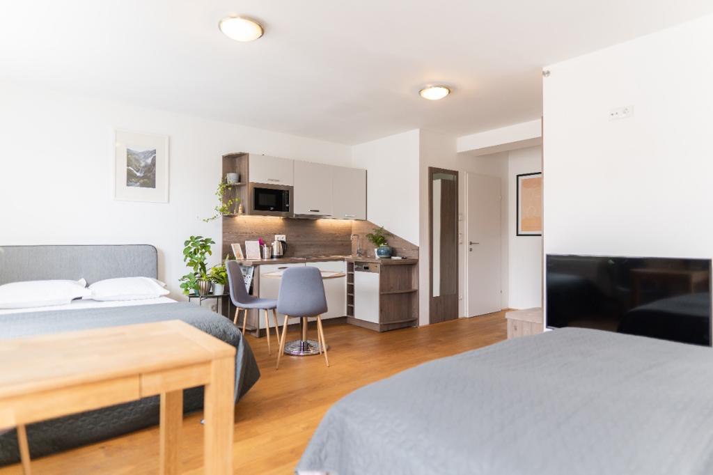 Die Unterkünfte verfügen über Parkettböden und verfügen außerdem über eine voll ausgestattete Küchenzeile mit einem Kühlschrank, einen Essbereich, einen TV (Flachbildfernseher) und ein eigenes Badezimmer mit einer Dusche und einem Haartrockner. Eine Mikrowelle, ein Kochfeld und ein Wasserkocher sind ebenfalls vorhanden.